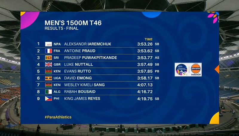 На своей коронной дистанции 1500 метров в дисциплине Т-46 уроженец Устьянского округа в очередной раз доказал, что для настоящих чемпионов не существует непреодолимых барьеров, завоевав золотую медаль. Он завершил победный забег за 3:53.26 сотых секунды. Этот результат является лучшим для Александра Яремчука в сезоне.