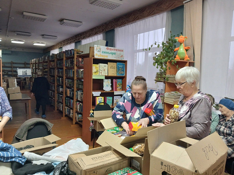 На передовую отправлены два десятка коробок с продуктами питания, сладостями, теплой одеждой, обувью, а также с сухим душем и маскировочными нашлемниками от участников клуба «Активное долголетие» библиотеки поселка Двинской.