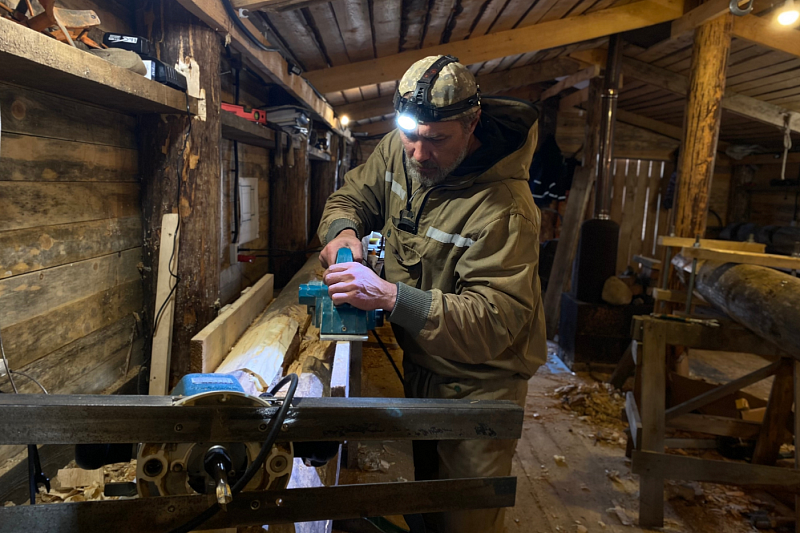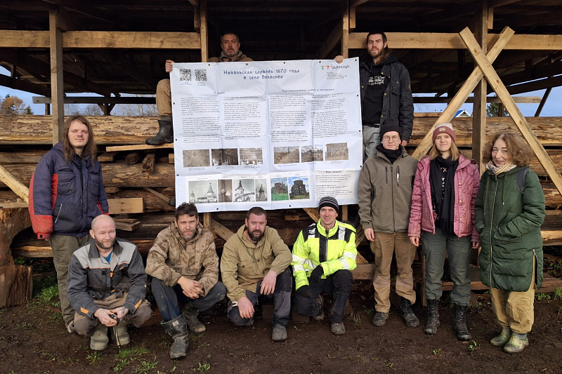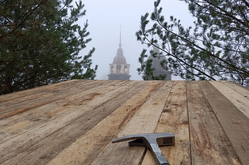 Деревянный шатровый храм 1670 года постройки реставрируется методом полной переборки. Сейчас мастера-реставраторы делают вычинки в старинных бревнах, чтобы сохранить как можно больше исторического материала.