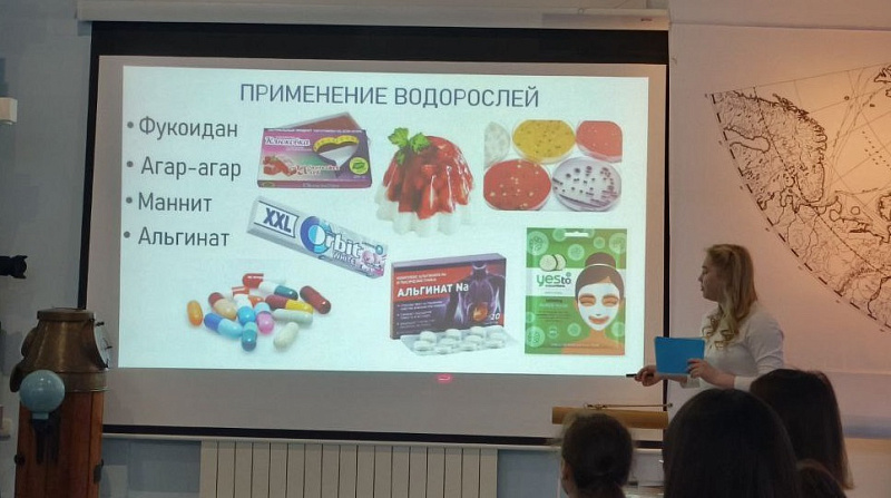 Аспирант Федерального исследовательского центра комплексного изучения Арктики Уро РАН Татьяна Ловдина рассказала ребятам об уникальности северных морских водорослей, а также о важности их бережной добычи и применении в различных отраслях.