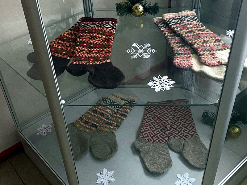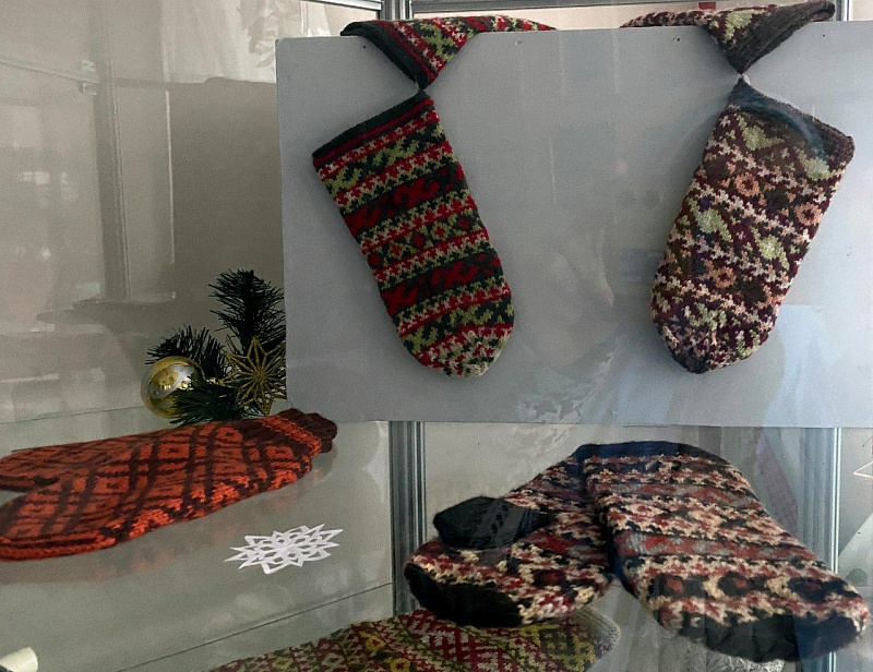 Посетители выставки могут не только увидеть работы, но и прочувствовать дух времени: рукавицы с резными узорами будто переносят в атмосферу пинежской избы, а теплые шерстяные чулки напоминают о домашнем очаге и заботе мастерицы.